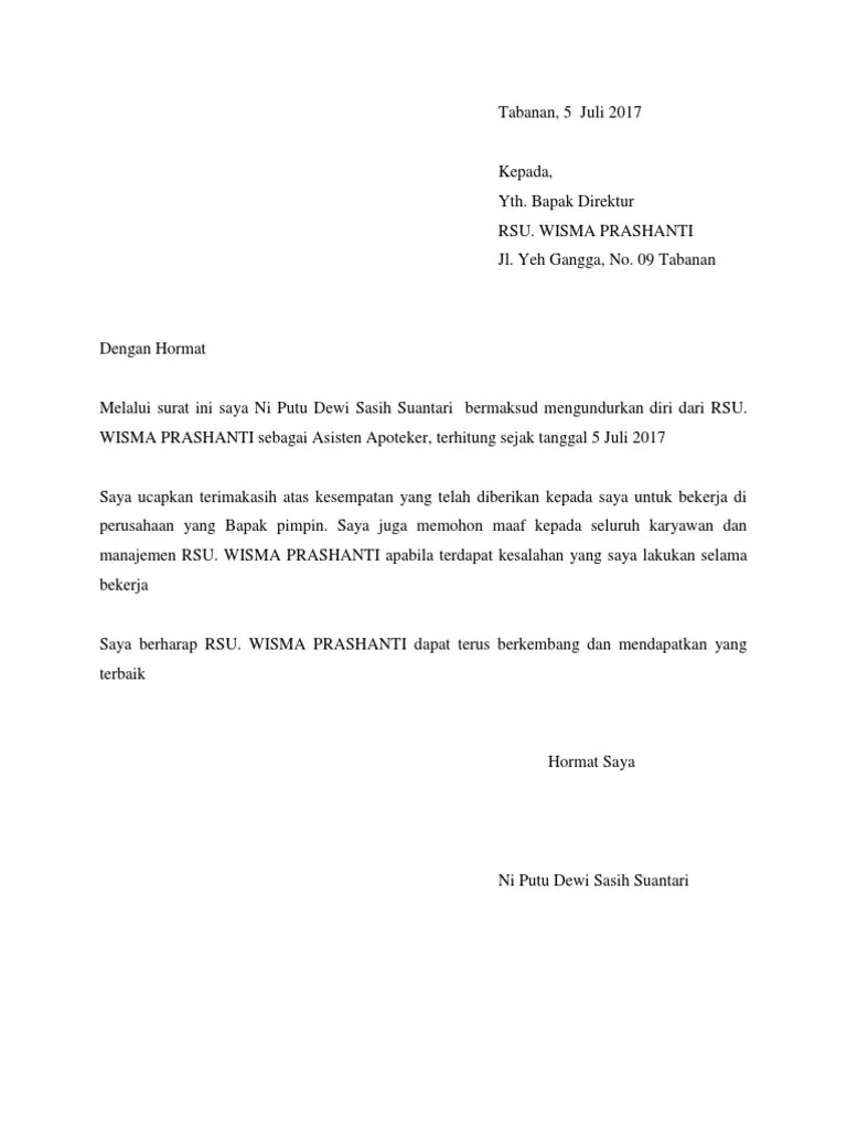 Tanggal dan tempat penulisan surat pengunduran diri · 2. Langsung simak contoh surat pengunduran diri kerja (resign) resmi yang baik dan benar dalam bahasa indonesia serta bahasa inggris ini! Cara dan langkah yang harus dilakukan sebelum mengajukan resign. Berikut kami berikan contoh beberapa surat resign yang dapat anda jadikan referensi untuk menulis surat pengunduran diri yang baik dan benar. Contoh surat pengunduran diri kerja resign yang baik dan benar, surat resign bahasa inggris untuk berhenti bekerja dari perusahan atau .
